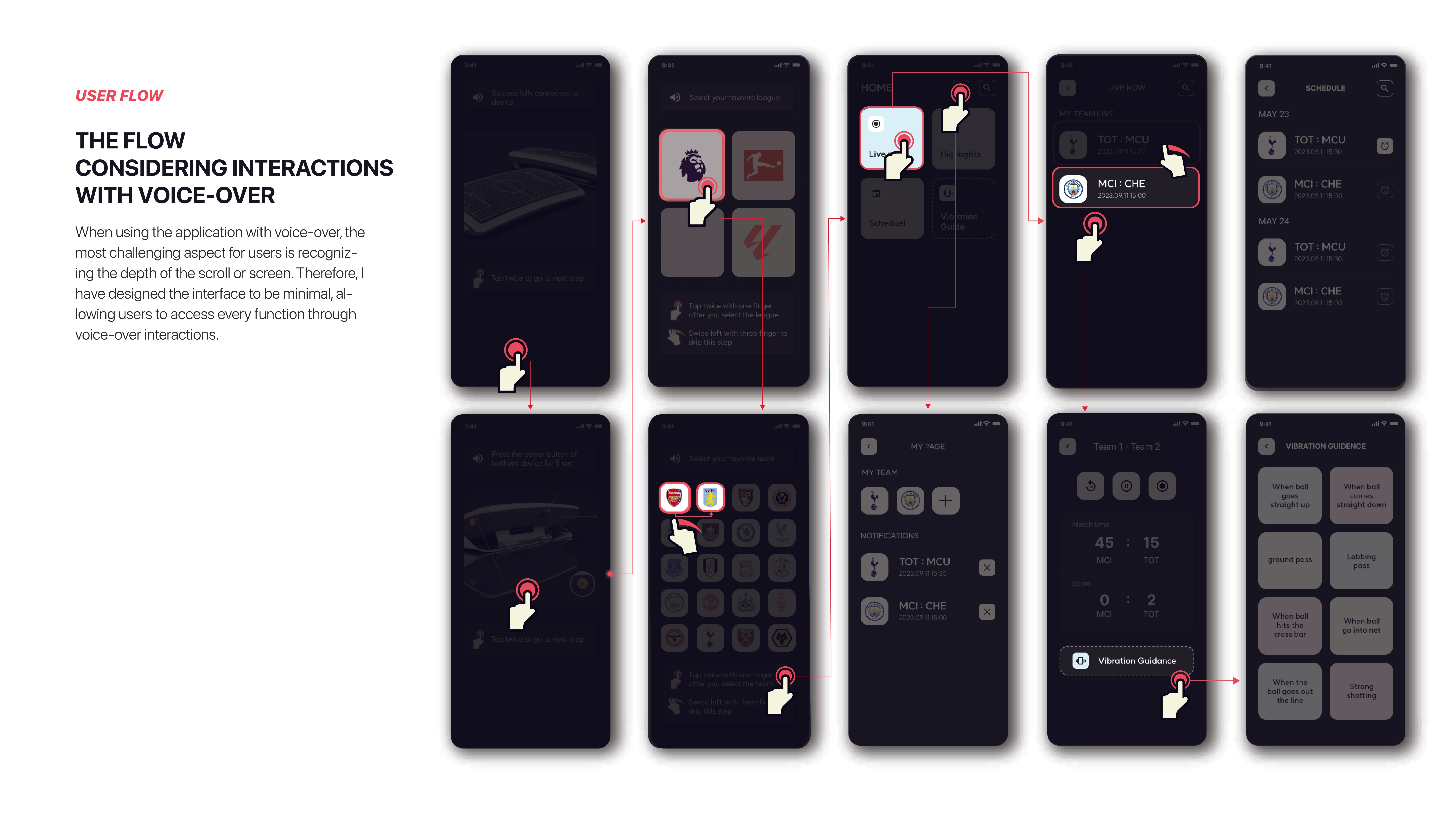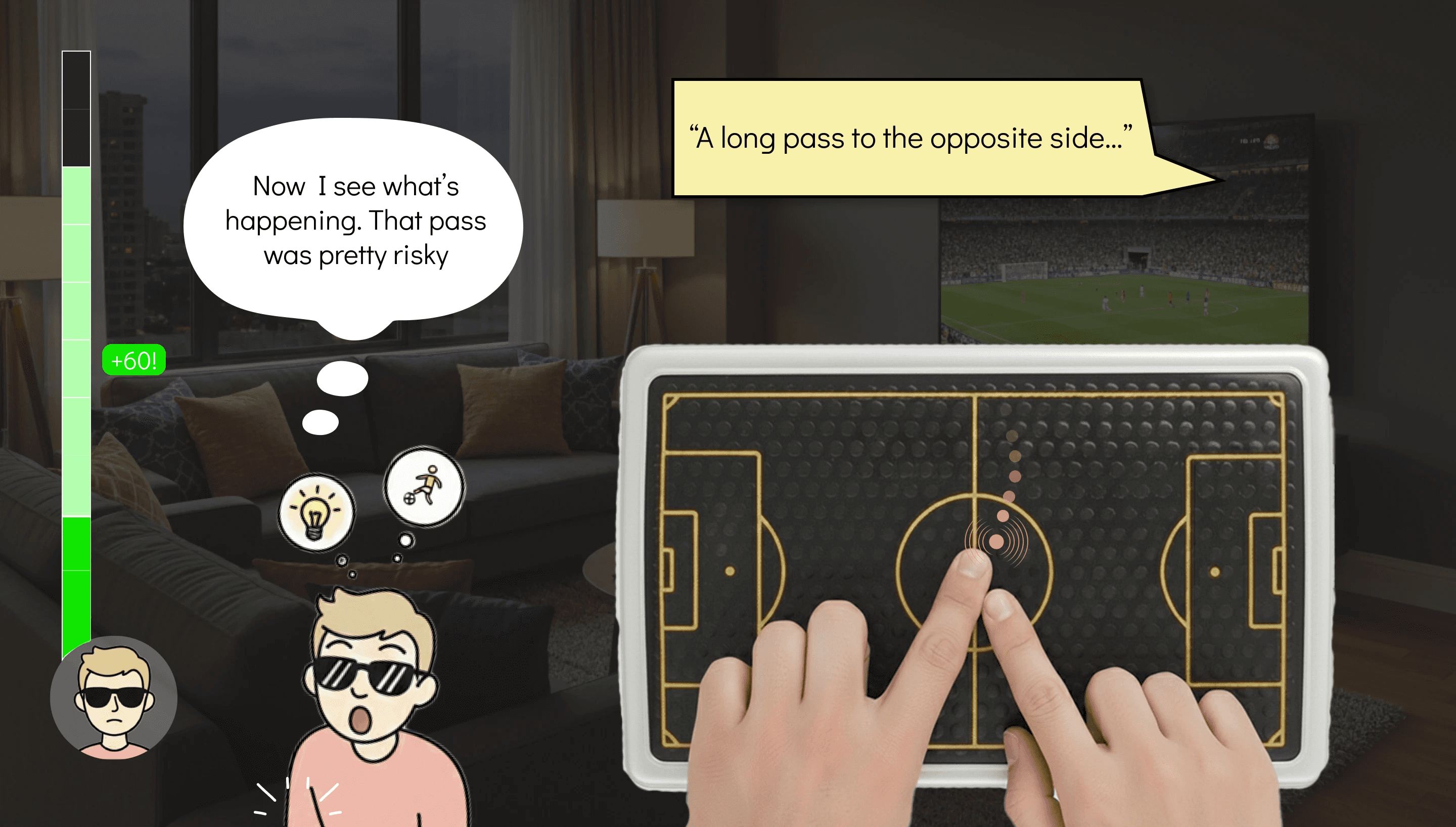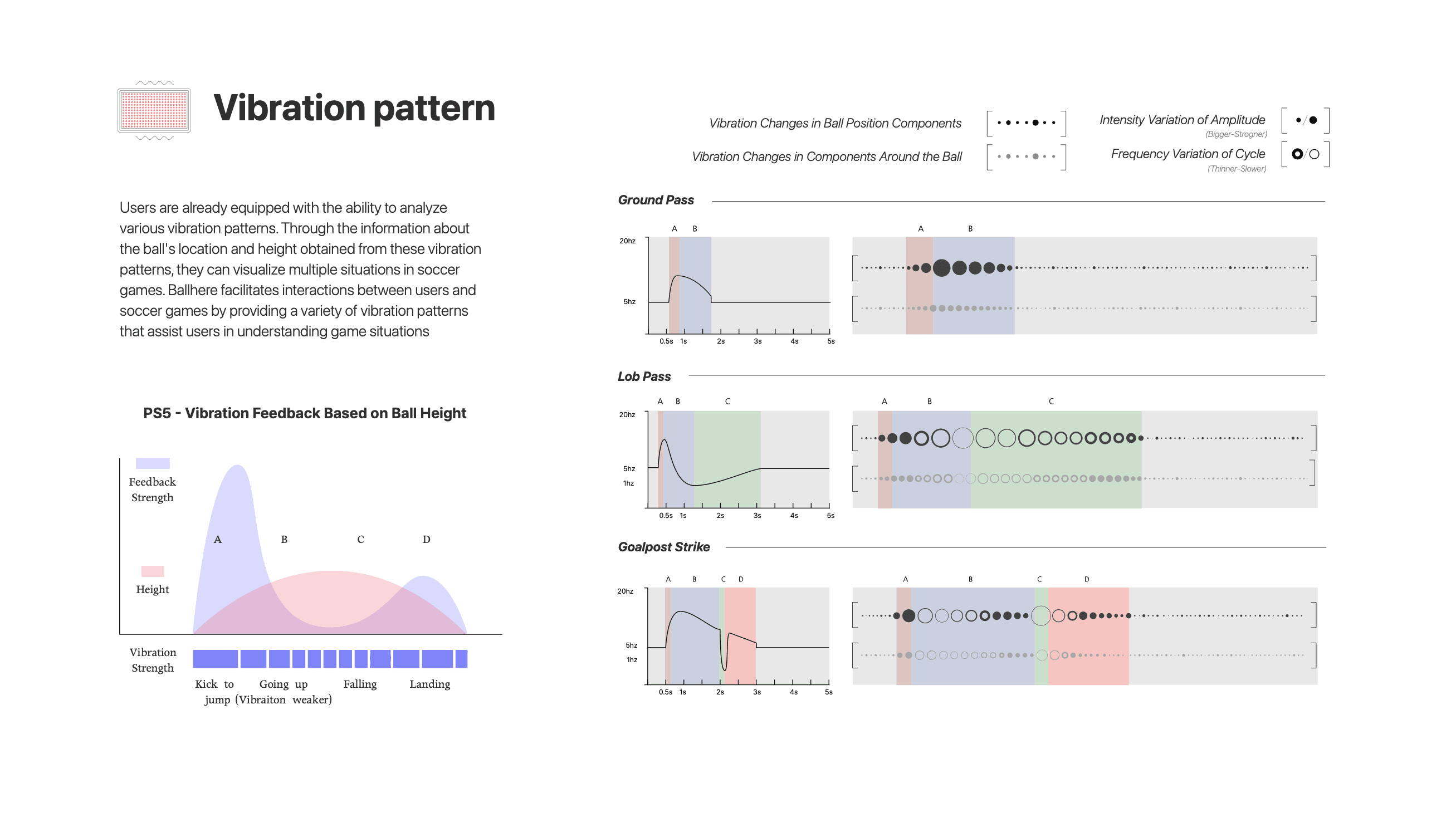 Users are already capable of analyzing various vibration patterns. Based on information about the ball's location and height obtained through these patterns, they can visualize multiple situations in a soccer game. Ballhere does not simply convey the ball's position to the user's fingers; it provides a variety of vibration patterns to help users more concretely imagine the dynamic flow of the game, thereby assisting their understanding of match situations and facilitating interactions between users and the soccer game.