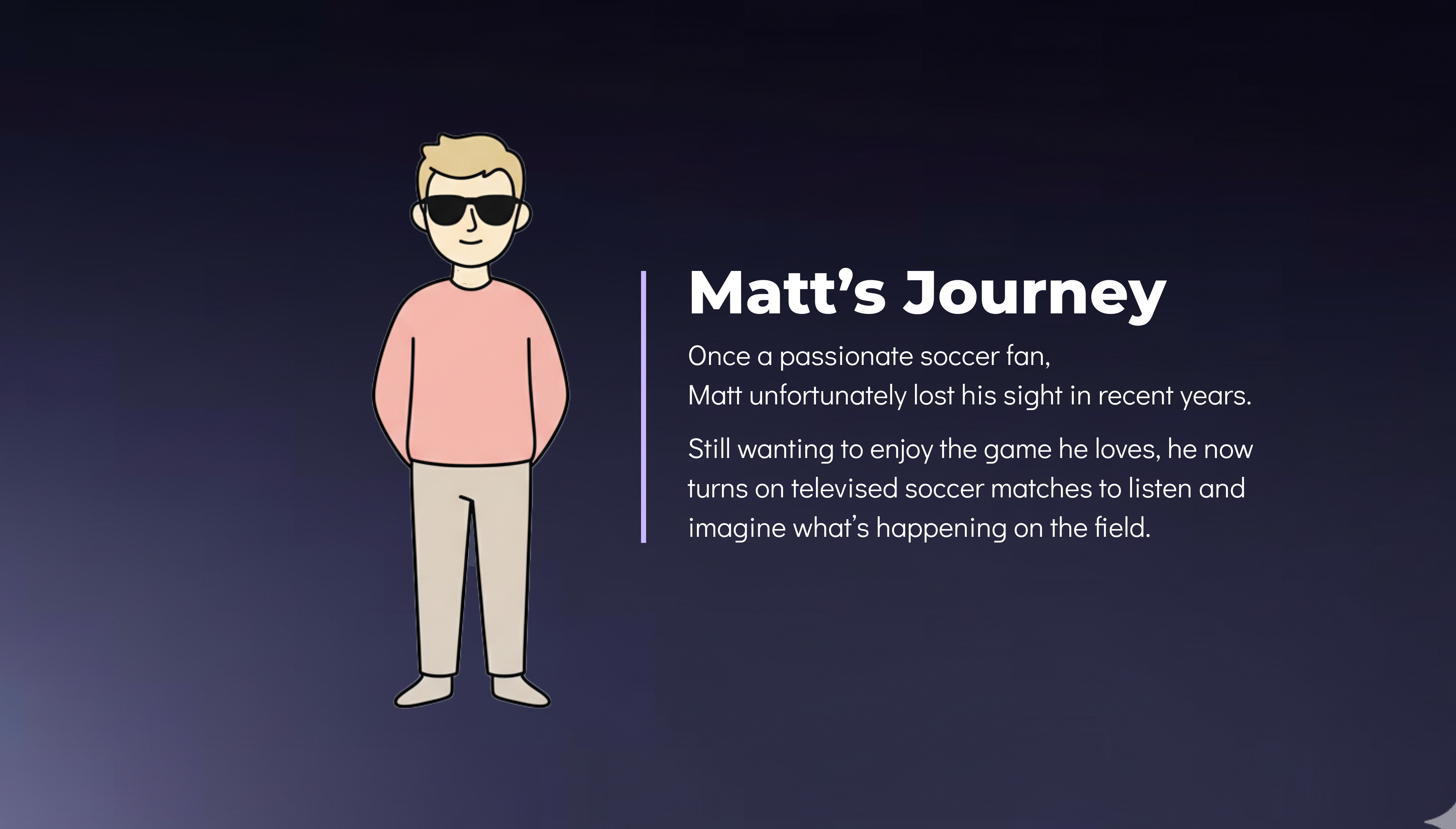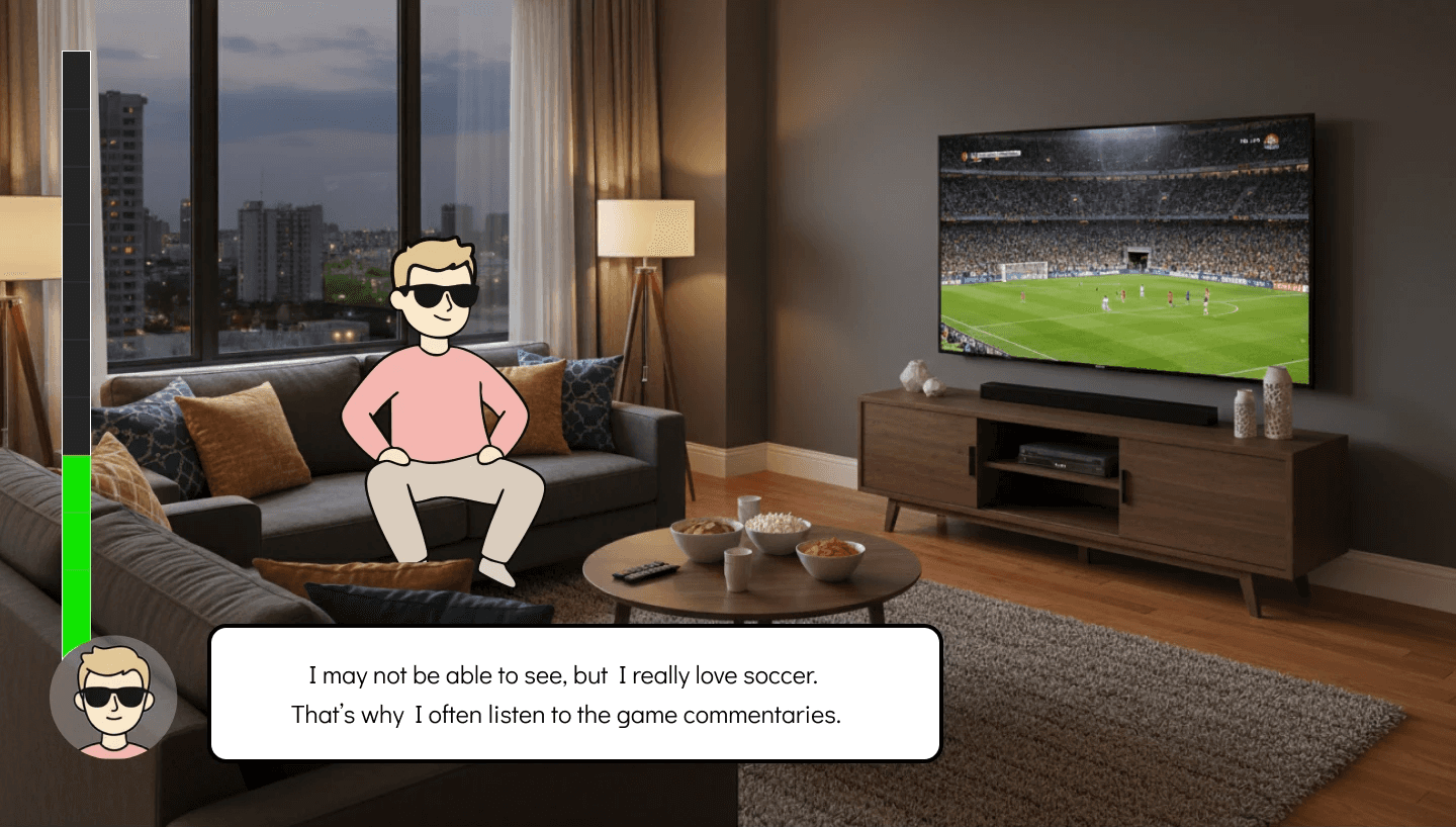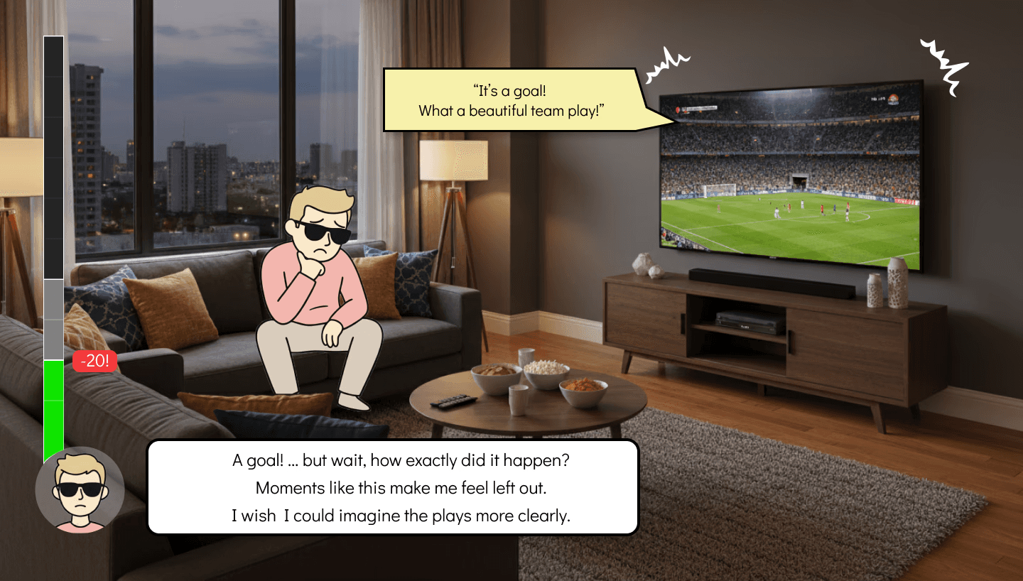 However, this was not the case for people with visual impairments. As someone with full vision, I found it difficult to imagine what they feel before, during, and after watching a soccer match, or how they process and make sense of the game through their own emotional and cognitive experiences.