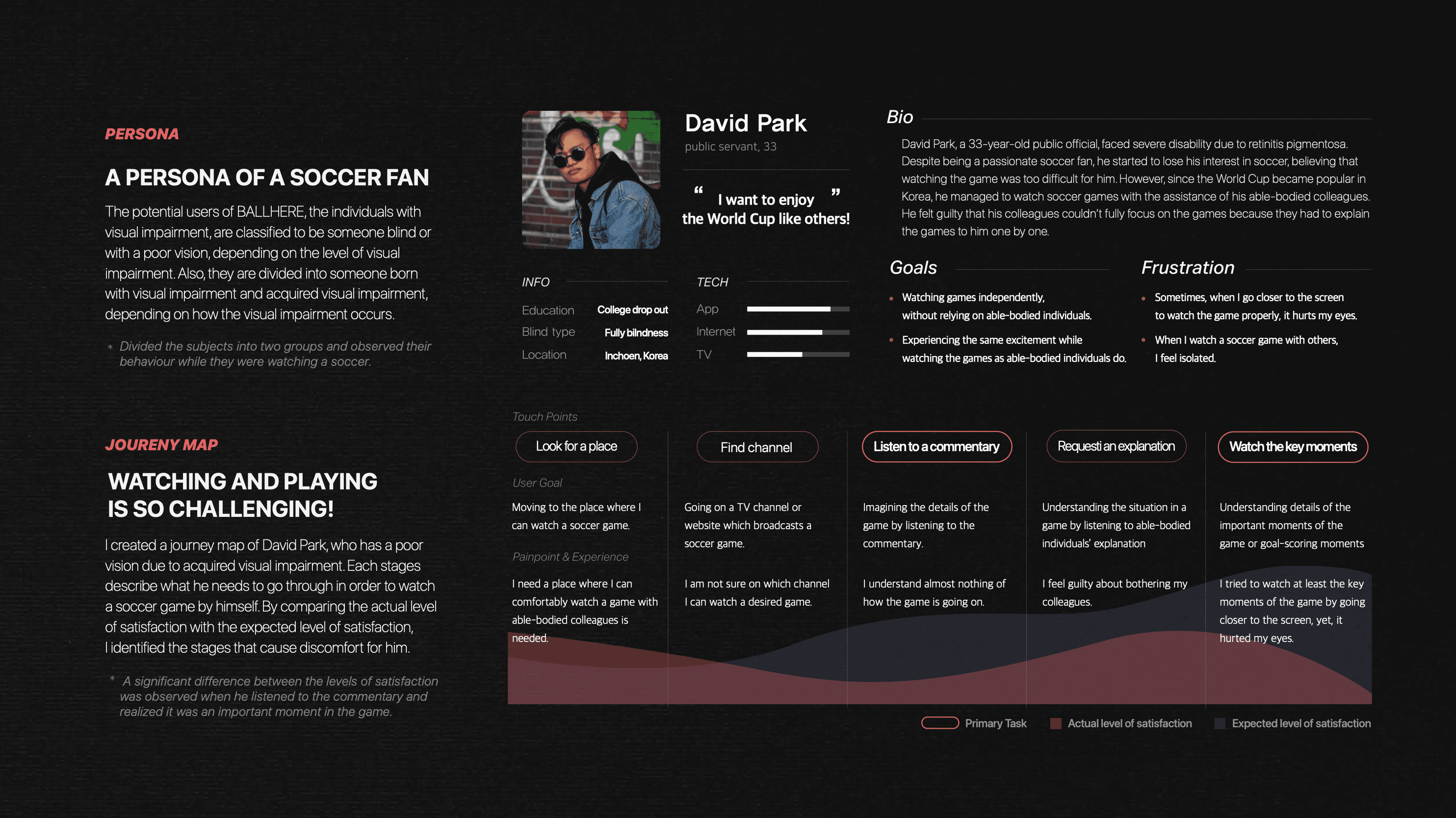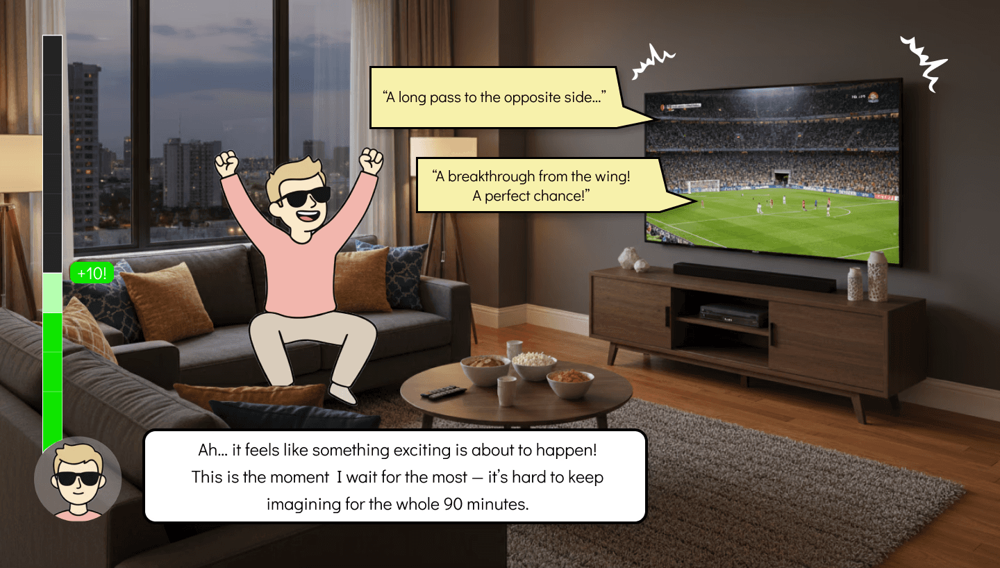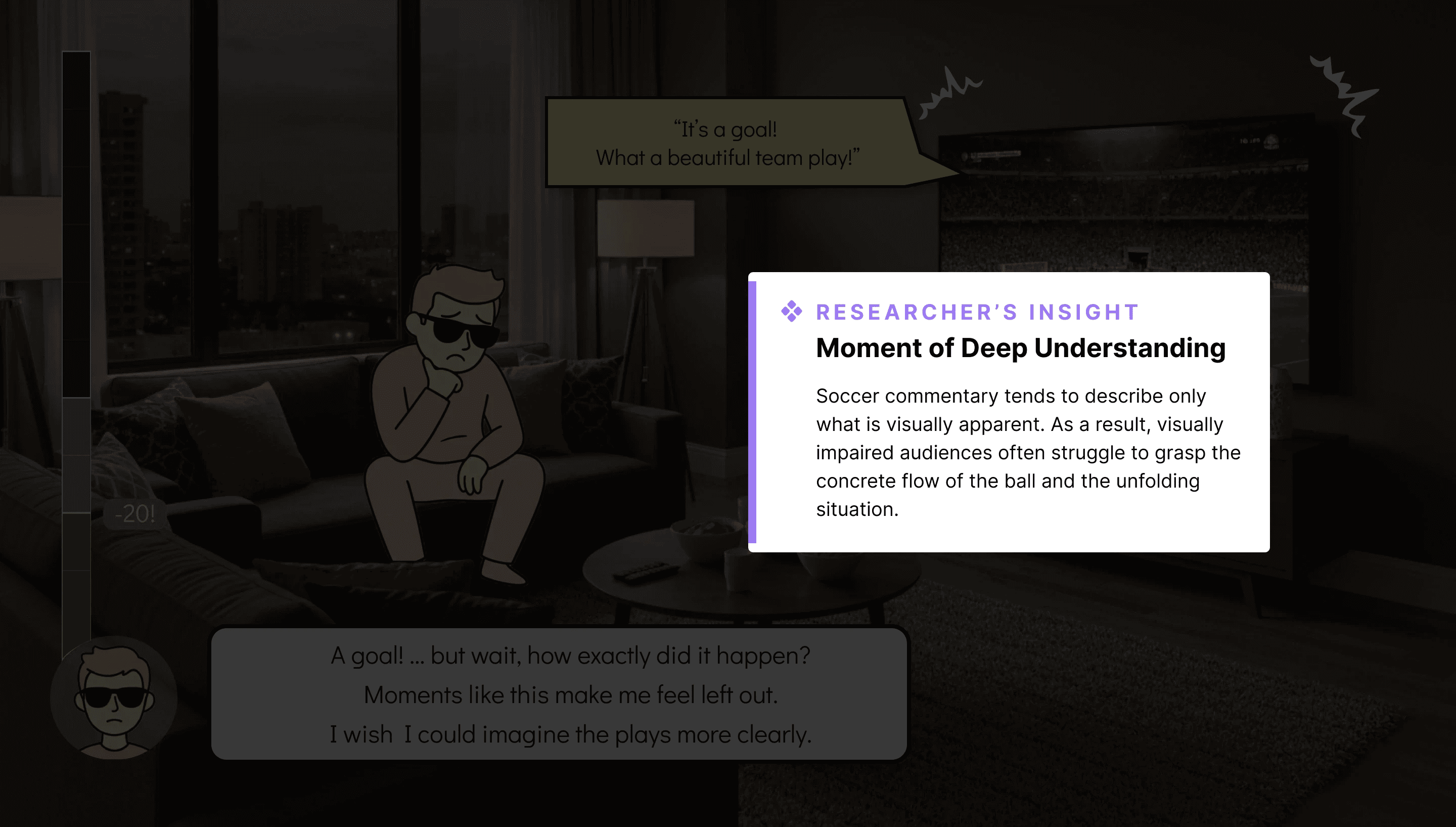However, this was not the case for people with visual impairments. As someone with full vision, I found it difficult to imagine what they feel before, during, and after watching a soccer match, or how they process and make sense of the game through their own emotional and cognitive experiences.